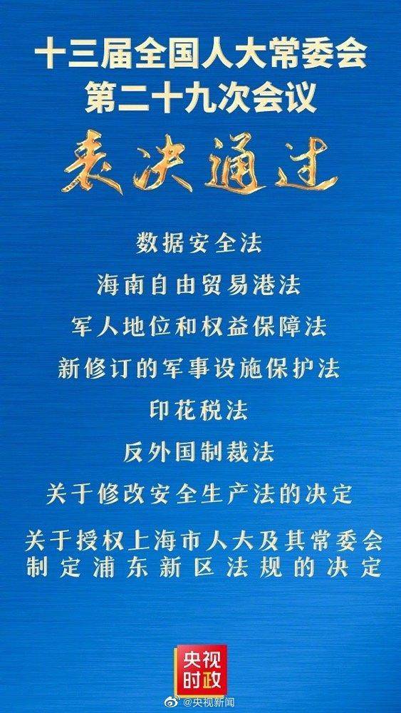 《数据安全法》表决通过 据央视消息,6月10日,我国数据领域基础性法律《数据安全法(草案)》经十三届全国人大常委会第二十九次会议表决通过。将于2021年9月1日起实施。 图片来源《央视新闻》官方微博
